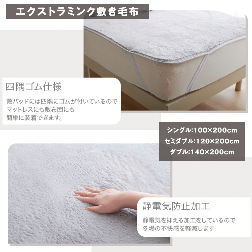 シングル:100×200cm、セミダブル:120×200cm、ダブル:140×200cm