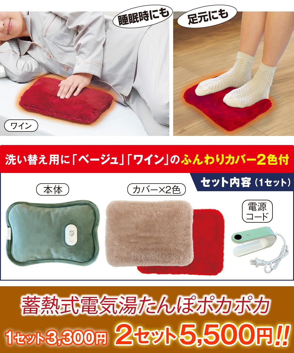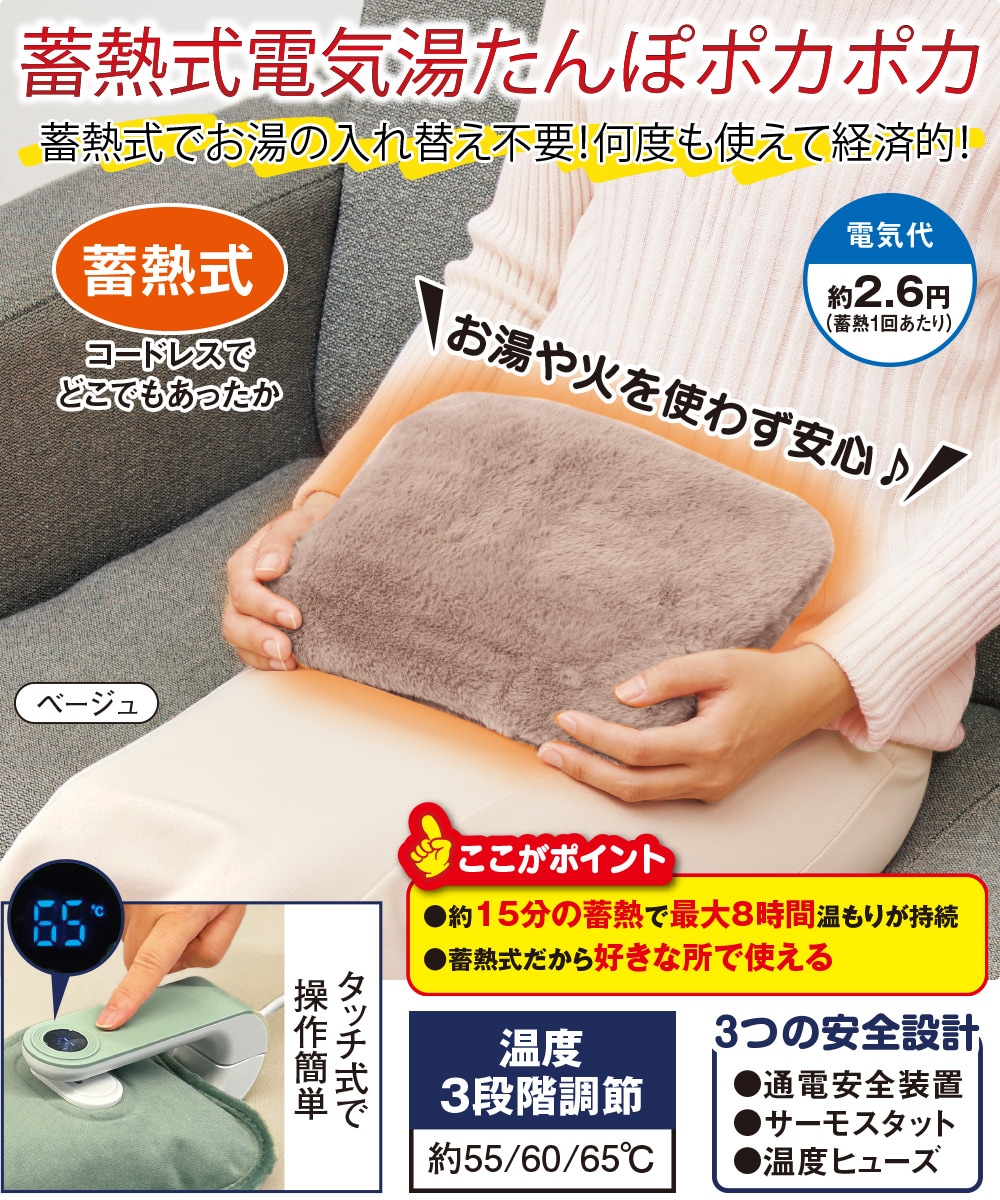 \お湯や火を使わず安心♪/ 蓄熱式でお湯の入れ替え不要!何度も使えて経済的! 洗い替え用にベージュ・ワインのふんわりカバー2色付! ●約15分の蓄熱で最大8時間温もりが持続 ●蓄熱式だから好きな所で使える 【3つの安全設計】通電安全装置・サーモスタット・温度ヒューズ 【温度3段階調節】約55/60/65度 【電気代】約2.6円(蓄熱1回あたり) ●タッチ式で操作簡単 ●睡眠時にも ●足元にも