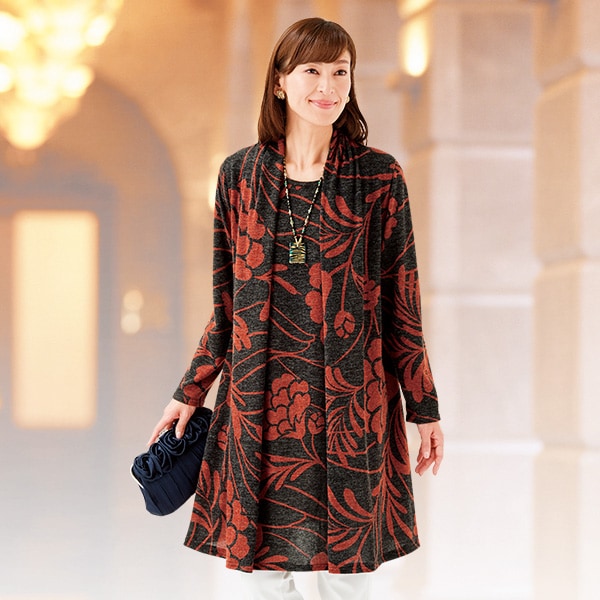 大胆なプリント柄が目を引く、重ね着風のロングプルオーバー! 前身頃の重なりがロングカーディガン風に見え、これ一枚でコーディネイトが完成。柔らかな素材で落ち感もきれい。 ●レンガ系 大胆な植物柄でしなやかな手触り。
