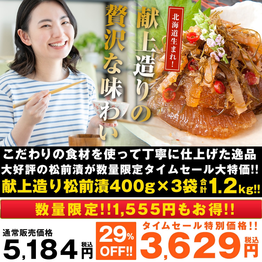 国産のするめいか、がごめ昆布白口浜真昆布に上質の数の子を贅沢に使用した味わい深い逸品。 慶長4年徳川家康より松前藩主に任命された豪族、蛎崎慶広に献上されたと言われる、北海道を代表する「松前漬」を現代風に再現しました。 当時は地元産の最高級昆布と厚切りのするめを醤油と昆布だし、かつおだしで味付けしていましたが、「献上造り松前漬」では食感の良い良質の数の子を加えじっくり熟成させる事で、献上造りの名にふさわしい、まろやかで風味豊かな「松前漬」に仕上げました。 大容量400g×3袋=1.2kg!