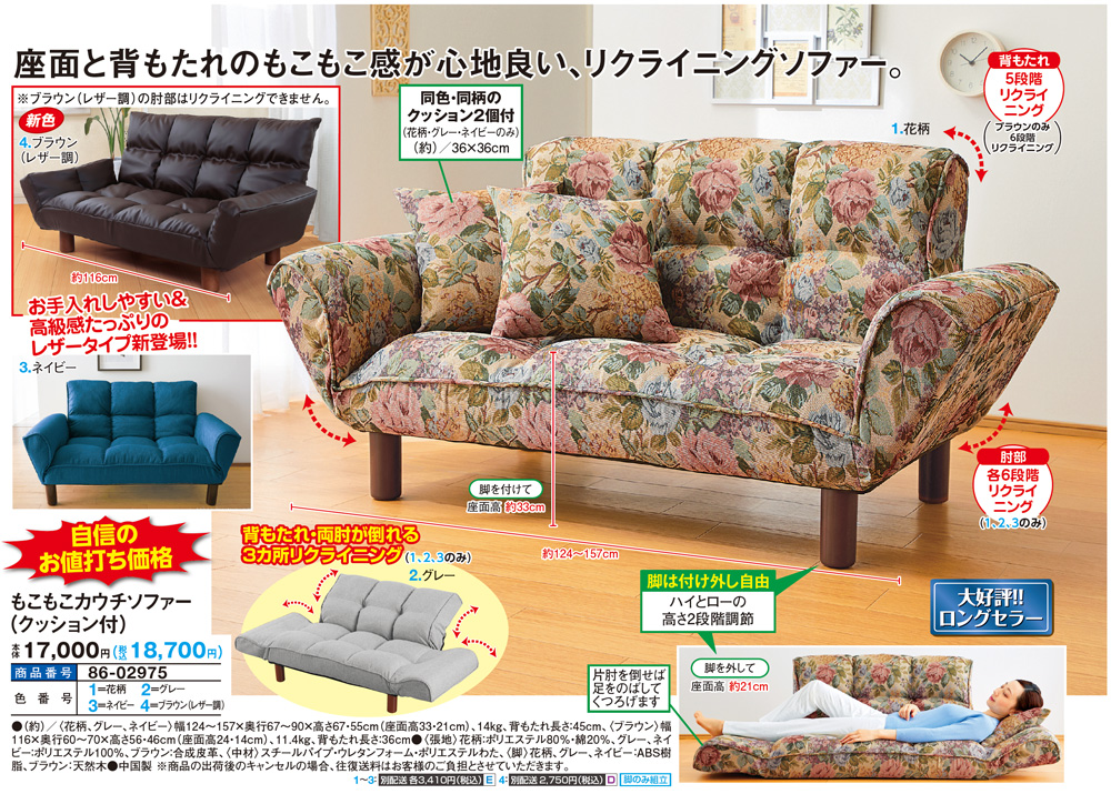 座面と背もたれのもこもこ感が心地良い、リクライニングソファー! ●大好評!!ロングセラー 背もたれ 両肘が倒れる3カ所リクライニング (花柄 グレー ネイビーのみ) 同色 同柄のクッション2個付 (花柄 グレー ネイビーのみ) (約)/36×36cm 【背もたれ】 5段階リクライニング (ブラウンのみ6段階リクライニング) 【肘部】 各6段階リクライニング (花柄 グレー ネイビーのみ) 【脚は付け外し自由】 ハイとローの高さ2段階調節 脚を外して座面高 約21cm 脚を付けて座面高 約33cm 片肘を倒せば足をのばしてくつろげます お手入れしやすい&高級感たっぷりのレザータイプ新登場!! ●自信のお値打ち価格