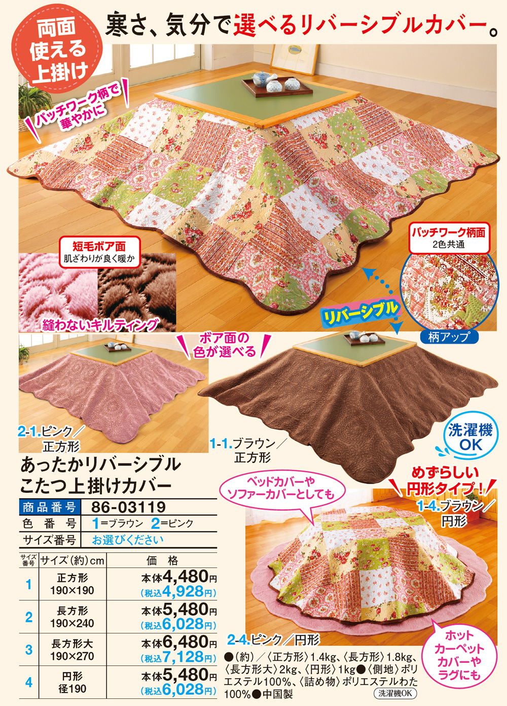 寒さ、気分で選べるリバーシブルカバー! 両面使える上掛け パッチワーク柄で華やかに 【リバーシブル】 \ボア面の色が選べる/ ●短毛ボア面 肌ざわりが良く暖か 縫わないキルティング ●パッチワーク柄面 2色共通 \めずらしい円形タイプ!/ ●ベッドカバーやソファーカバーとしても ●ホットカーペットカバーやラグにも