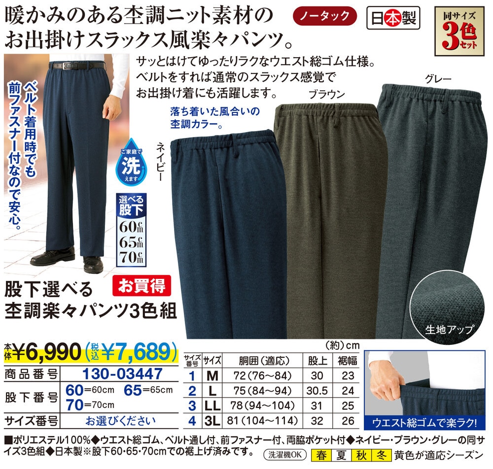 高齢の父の為に購入しました。Lサイズで股下60センチのズボンを探していたので、この商品を見つけたときは本当に嬉しかったです。ウエストが総ゴムなので着衣も楽、伸縮性もありとても履きやすいと喜んでいました。見た目は普通のズボンなので、家の中だけでなくそのままお出かけもOK、本当に良いお買い物が出来ました。次は股下60センチの裏起毛パンツも購入予定です。