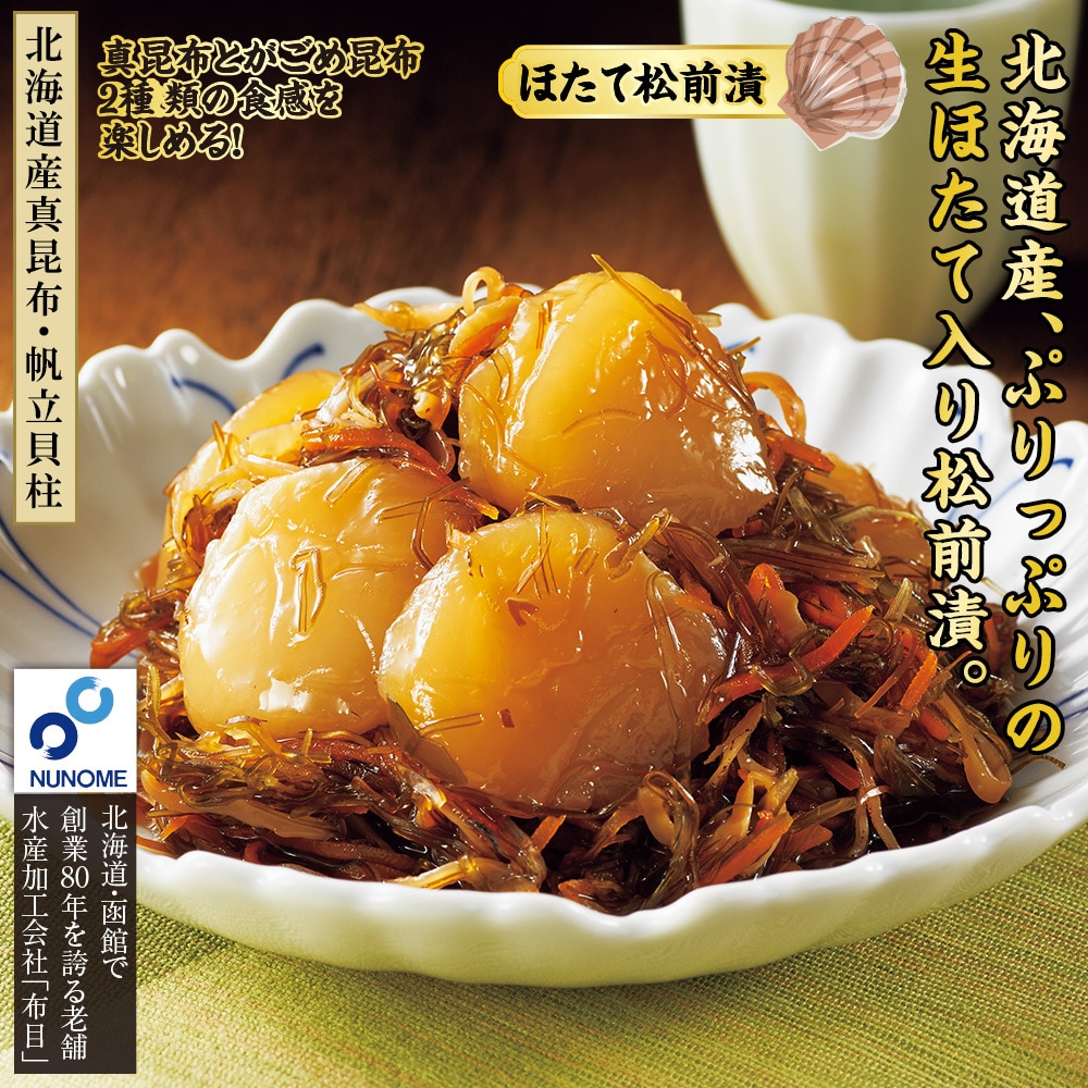 真昆布とがごめ昆布2種類の食感を楽しめる! お刺身用の生ほたての貝柱を贅沢に使いました。 味付けは北海道産丸大豆醤油をベースに、昆布とカツオのエキスを加え、やや甘口に仕上げています。 お買得1kg!