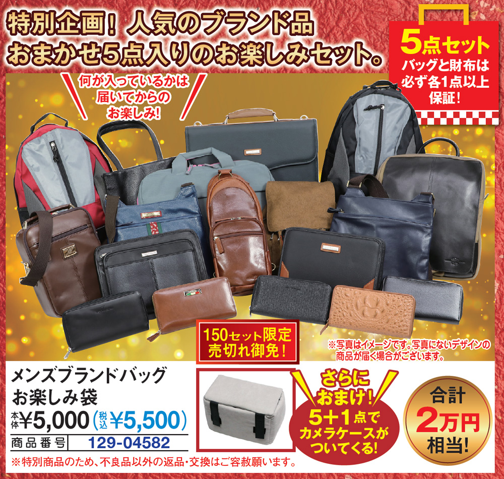 特別企画! 人気のブランド品おまかせ5点入りのお楽しみセット! 何が入っているかは届いてからのお楽しみ! 【5点セット】バッグと財布は必ず各1点以上保証! 【さらにおまけ!】5+1点でカメラケースがついてくる! ●合計2万円相当!