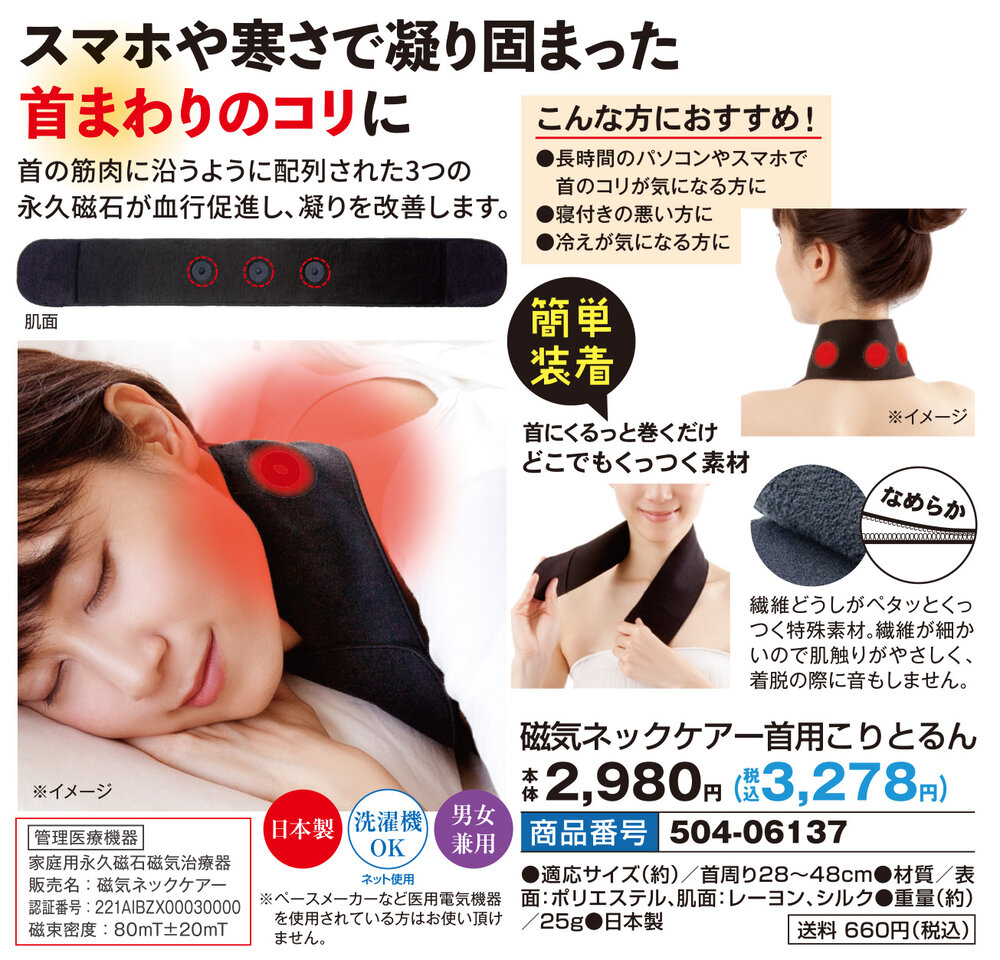 ●首の筋肉に沿うように配列された3つの永久磁石が血行促進し、凝りを改善します。 【簡単装着】 ●首にくるっと巻くだけ ●どこでもくっつく素材 ●繊維どうしがペタッとくっつく特殊素材。繊維が細かいので肌触りがやさしく、着脱の際に音もしません。 【こんな方におすすめ!】 ●長時間のパソコンやスマホで首のコリが気になる方に ●寝付きの悪い方に ●冷えが気になる方に 【管理医療機器】 家庭用永久磁石磁気治療器 販売名:磁気ネックケアー 認証番号:221AIBZX00030000 磁束密度:80mT±20mT