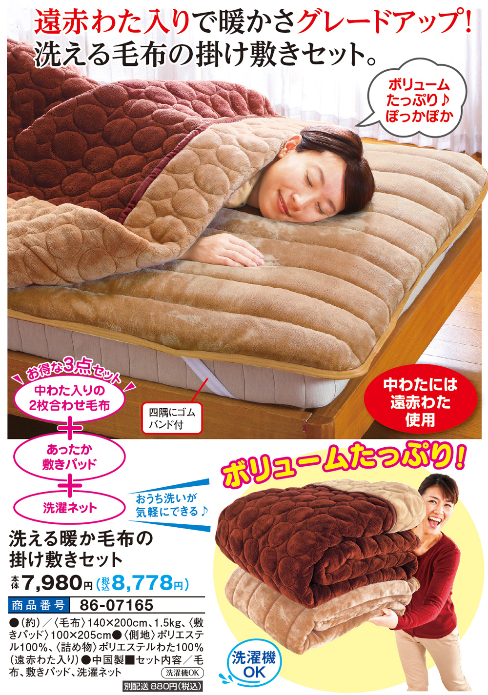 遠赤わた入りで暖かさグレードアップ!洗える毛布の掛け敷きセット! ボリュームたっぷり♪ぽっかぽか ●中わたには遠赤わた使用 四隅にゴムバンド付 \お得な3点セット/ 中わた入りの2枚合わせ毛布+あったか敷きパッド+洗濯ネット おうち洗いが気軽にできる♪