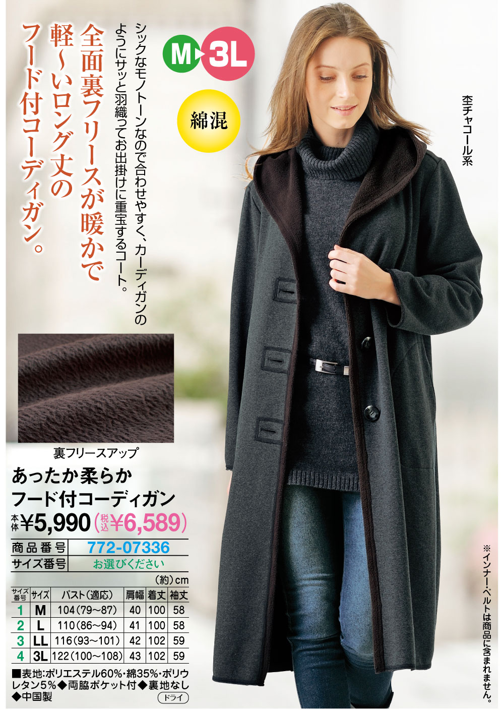 【サイズ(約)】 バスト(適応)、肩幅、着丈、袖丈 <M>104(79~87)cm、40cm、100cm、58cm <L>110(86~94)cm、41cm、100cm、58cm <LL>116(93~101)cm、42cm、102cm、59cm <3L>122(100~108)cm、43cm、102cm、59cm ■表地:ポリエステル60%・綿35%・ポリウレタン5% ◆両脇ポケット付 ◆裏地なし ◆中国製