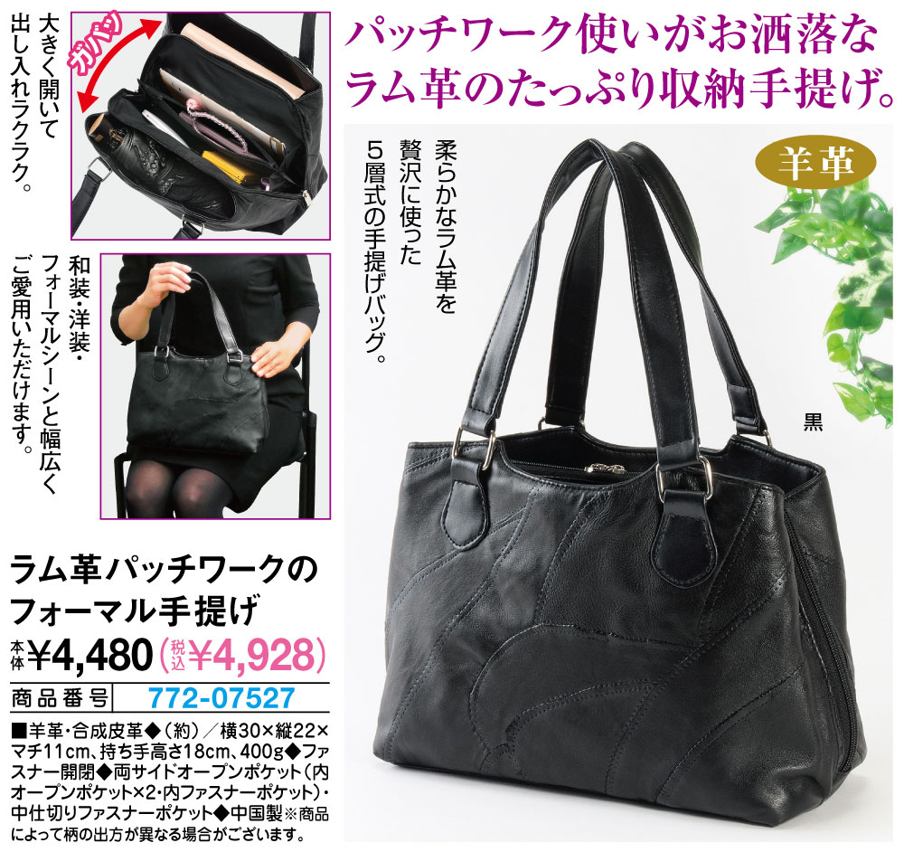パッチワーク使いがお洒落なラム革のたっぷり収納手提げ! 柔らかなラム革を贅沢に使った5層式の手提げバッグ。 大きく開いて出し入れラクラク。 和装・洋装・フォーマルシーンと幅広くご愛用いただけます。 ●ラム革