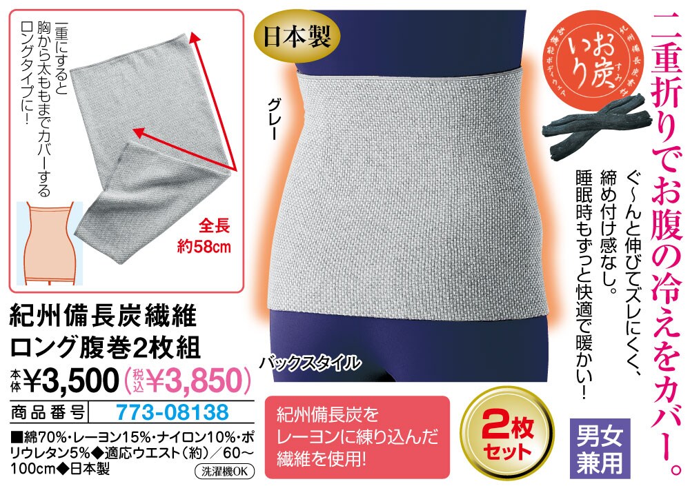 2重折りでお腹の冷えをカバー! ぐ~んと伸びてズレにくく、締め付け感なし。 睡眠時もずっと快適で暖かい! 紀州備長炭をレーヨンに練り込んだ繊維を使用! 全長約58cm!1重にすると胸から太ももまでカバーするロングタイプに! ●男女兼用