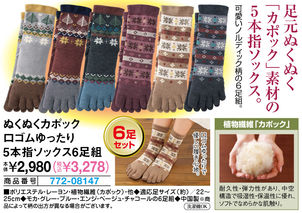 足元ぬくぬく「カポック」素材の5本指ソックス! 可愛いノルディック柄の6足組。 口ゴムゆったりで優しい履き心地。 【天然繊維「カポック」】 耐久性・弾力性があり、中空構造で吸湿性・保温性に優れ、ソフトで滑らかな肌触り。