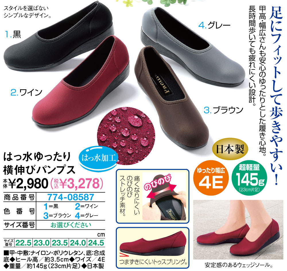 ■甲・中敷:ナイロン・ポリウレタン、底:合成底 ◆ヒール高/約3.5cm ◆ワイズ/4E ◆重量/約145g(23cm片足) ◆日本製