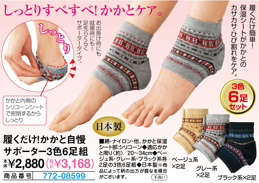 ■綿・ナイロン・他、かかと保湿シート部:シリコーン ◆適応かかと周り(約)/20~34cm ◆ベージュ系・グレー系・ブラック系各2枚の3色6足組 ◆日本製