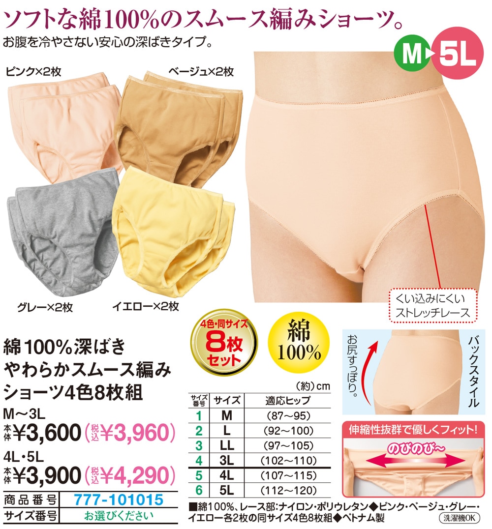 ソフトな綿100%のスムース編みショーツ! お腹を冷やさない安心の深ばきタイプ。 くい込みにくいストレッチレース お尻まですっぽり。 伸縮性抜群で優しくフィット! ●M~5L ●4色・同サイズ8枚セット ●綿100%