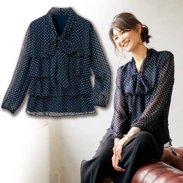 程良い透け感のあるブラウスは、胸元のリボンと4段ティアードで女性らしいデザイン。 前後身頃はカットソー素材なので一枚で着られます。