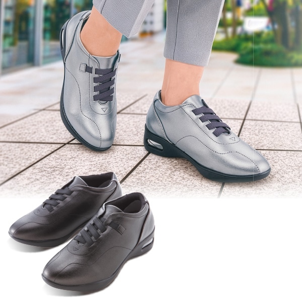 外反母趾対策のインソールを採用した美脚シューズ! 足と靴の専門家が開発した快適設計、ぐんぐん歩けて疲れにくいお洒落な1足。 衝撃を吸収するエアークッション内蔵 足当たり優しいかかとパッド 脱ぎ履きしやすいゴムヒモ仕様。 ゆったり5Eなのにスリムなフォルム。約5cmのヒールで美脚効果も! ●外反母趾対応 【ゆったり幅広5E】 お店では入手しにくい5Eのシューズです。 【外反母趾対策インソール】 ・土踏まずアーチサポート ・前滑りを防ぐ母趾球ホール ・ハニカムガードで衝撃吸収 ・指先を広げる中足骨パッド ・かかとを支えるカップインソール