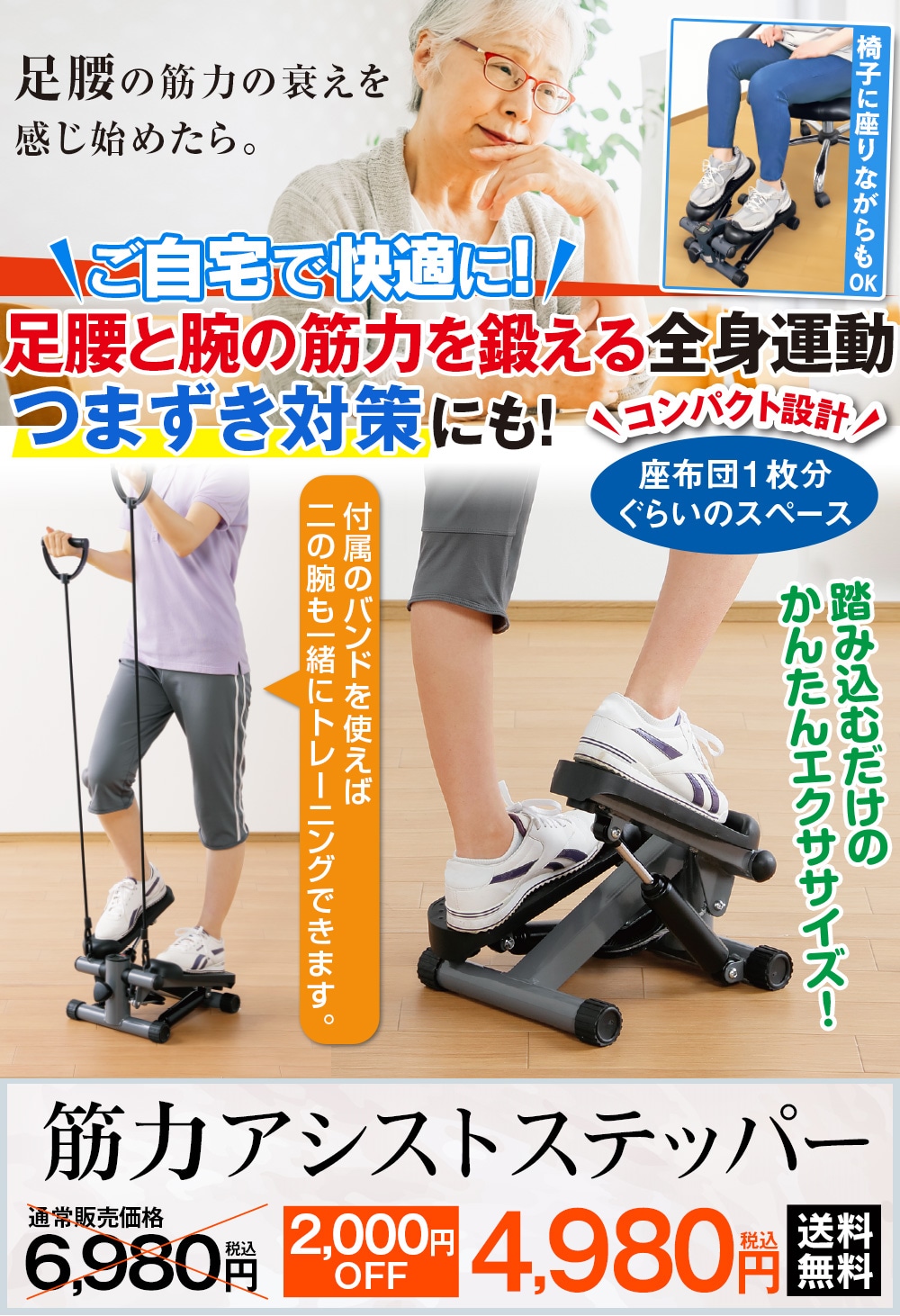踏み込むだけの簡単エクササイズ!ステップ運動で足腰の筋力アップ お尻、太もも、ふくらはぎをしっかりトレーニング! 付属のバンドを使えば二の腕も一緒にトレーニングできます。 【運動量をメーターでチェック!】 ・ステップ数・運動時間・消費カロリー・1分あたりの回数 【踏み込み幅調節可能】 ステップの高さを調節することで運動量を調節できます。 ◎コンパクト設計!座布団1枚分ぐらいのスペース