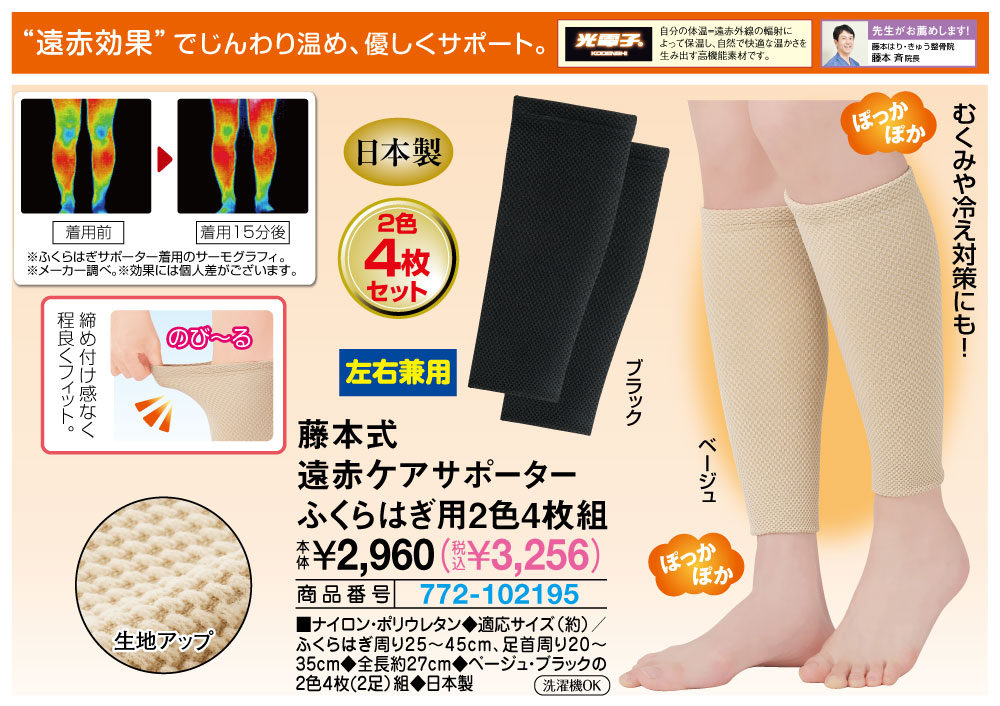 遠赤効果でふくらはぎを温め、優しくサポート! ソフトな着用感なので、就寝時にも使えます。 嫌な締め付け感なく程良くフィット。 むくみや冷え対策に! 【光電子】 自分の体温=遠赤外線の輻射によって保温し、自然で快適な温かさを生み出す高機能素材です。 先生がお薦めします! 藤本はり・きゅう整骨院 藤本 斉院長 ●2色4枚セット ●左右兼用