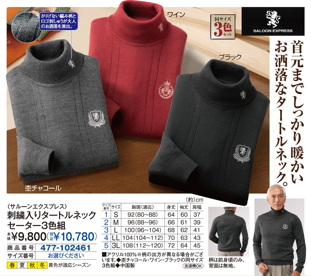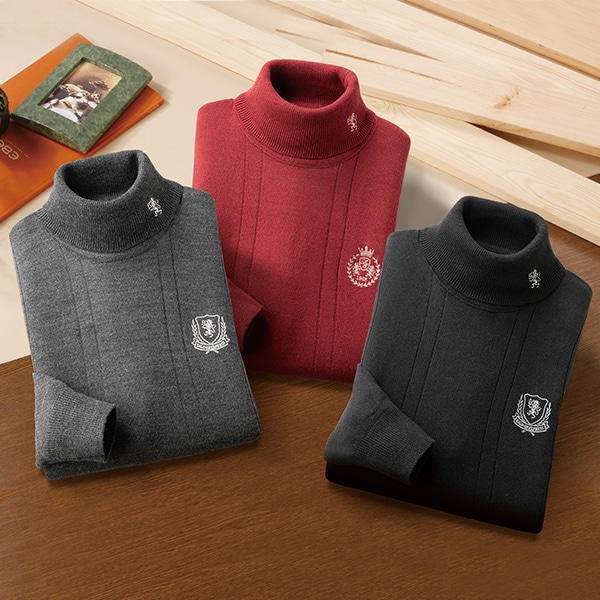 首元までしっかり暖かいお洒落なタートルネック さりげない編み柄とロゴ刺しゅうが大人のお洒落を演出。 柄は前身頃のみ、背面は無地。