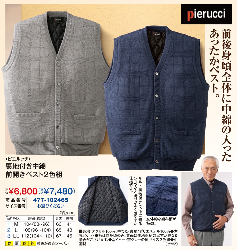 ■表地:アクリル100%、裏地・中わた:ポリエステル100% ◆左右ポケット ◆ネイビー系・杢グレーの同サイズ2色組 ◆中国製