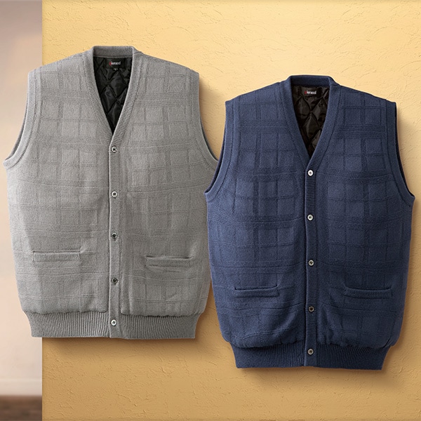 前後身頃全体に中綿の入ったあったかベスト 立体的な編み柄が特徴。 キルト裏地付きで、中に着るシャツなど滑りがよく着やすい仕様です。