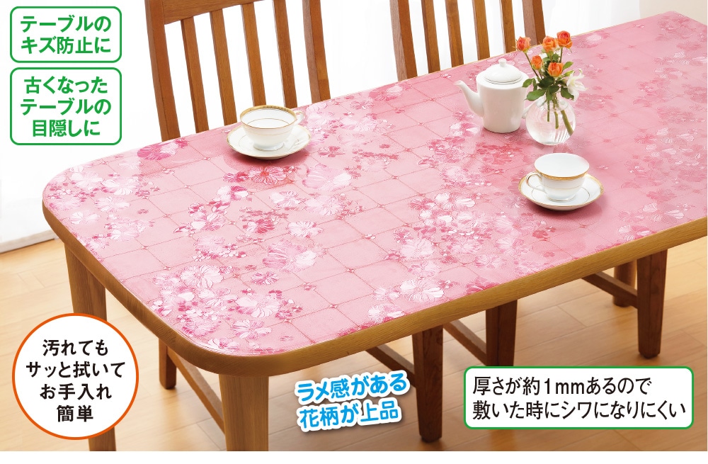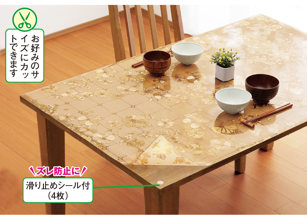 サッと敷くだけで食卓が華やかに! テーブルのキズ防止に、古くなったテーブルの目隠しに ズレ防止に!円形のテーブルにも! お好みのサイズや形にハサミで簡単にカット!布ではないのでほつれません 汚れてもサッと拭いてお手入れ簡単 厚さが約1mmあるので敷いた時にシワになりにくい キラキラのラメ感がある花柄 ●滑り止めシール付(4枚)