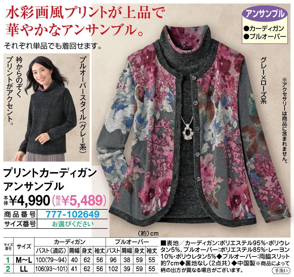 ■表地/カーディガン:ポリエステル95%・ポリウレタン5%、プルオーバー:ポリエステル85%・レーヨン10%・ポリウレタン5%
