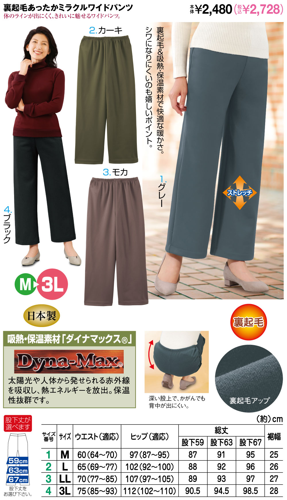 体のラインが出にくく、きれいに魅せるワイドパンツ! 裏起毛&吸熱・保温素材で快適な暖かさ シワになりにくいのも嬉しいポイント 深い股上で、かがんでも背中が出にくい 【吸熱・保温素材「ダイナマックス】 太陽光や人体から発せられる 赤外線を吸収し、熱エネルギーを放出。保温性抜群です。 ●裏起毛 ●ストレッチ ●M~3L