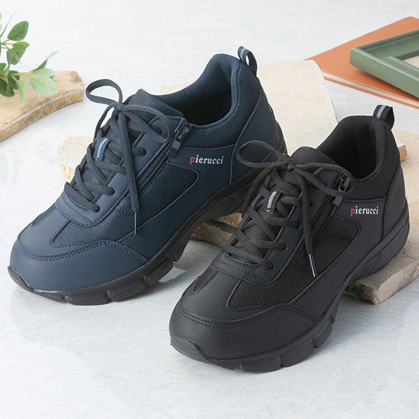 超軽量でサイドファスナー付。脱ぎはきしやすいウォーキングシューズ2色組。 かかと部分に光反射材を使用し、夜間の歩行をサポート。 底材は軽量で滑りにくく屈曲性に優れたソール。 サイドファスナー付きで脱ぎはき簡単。 超軽量:約190g(25.5cm片足) ゆったり4E