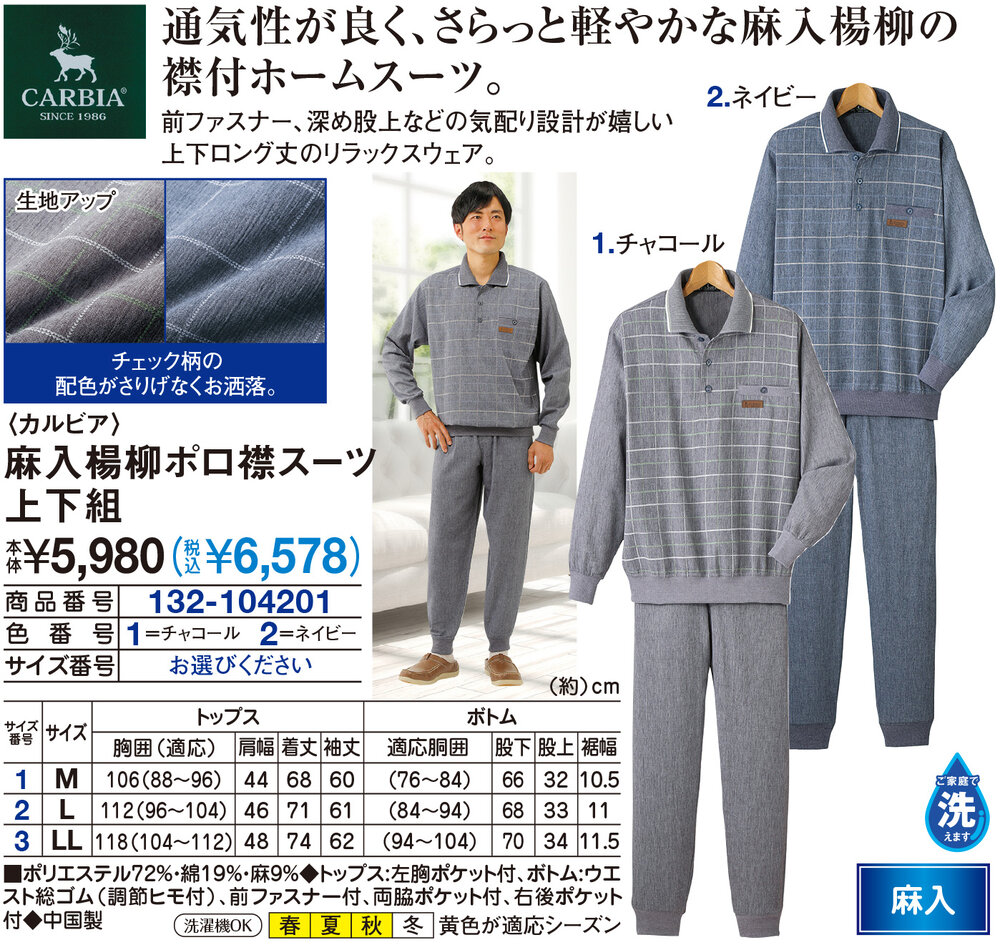 通気性が良く、さらっと軽やかな麻入楊柳の襟付ホームスーツ! 前ファスナー、深め股上などの気配り設計が嬉しい上下ロング丈のリラックスウェア。 チェック柄の配色がさりげなくお洒落。 ●麻入