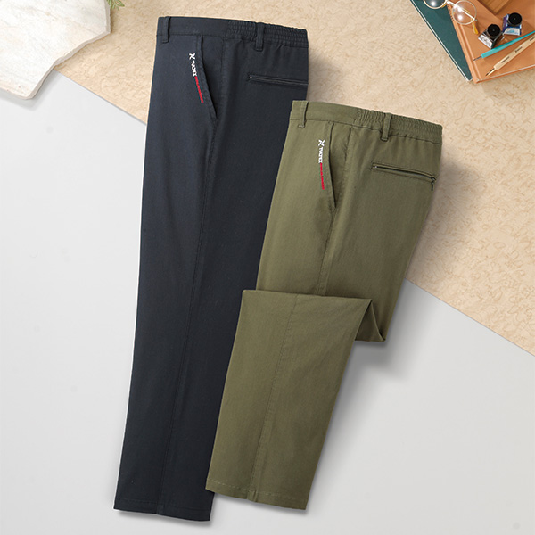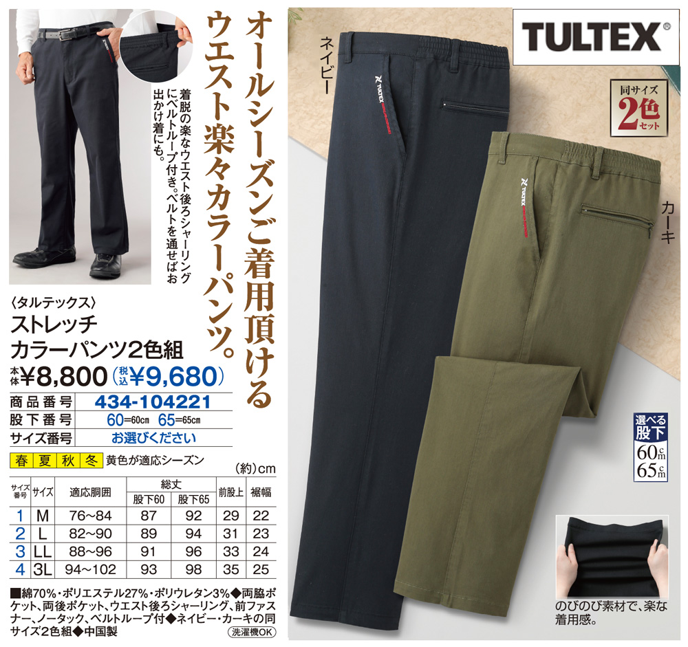 ■綿70%・ポリエステル27%・ポリウレタン3% ◆両脇ポケット、両後ポケット、ウエスト後ろシャーリング、前ファスナー、ノータック、ベルトループ付 ◆ネイビー・カーキの同サイズ2色組 ◆中国製