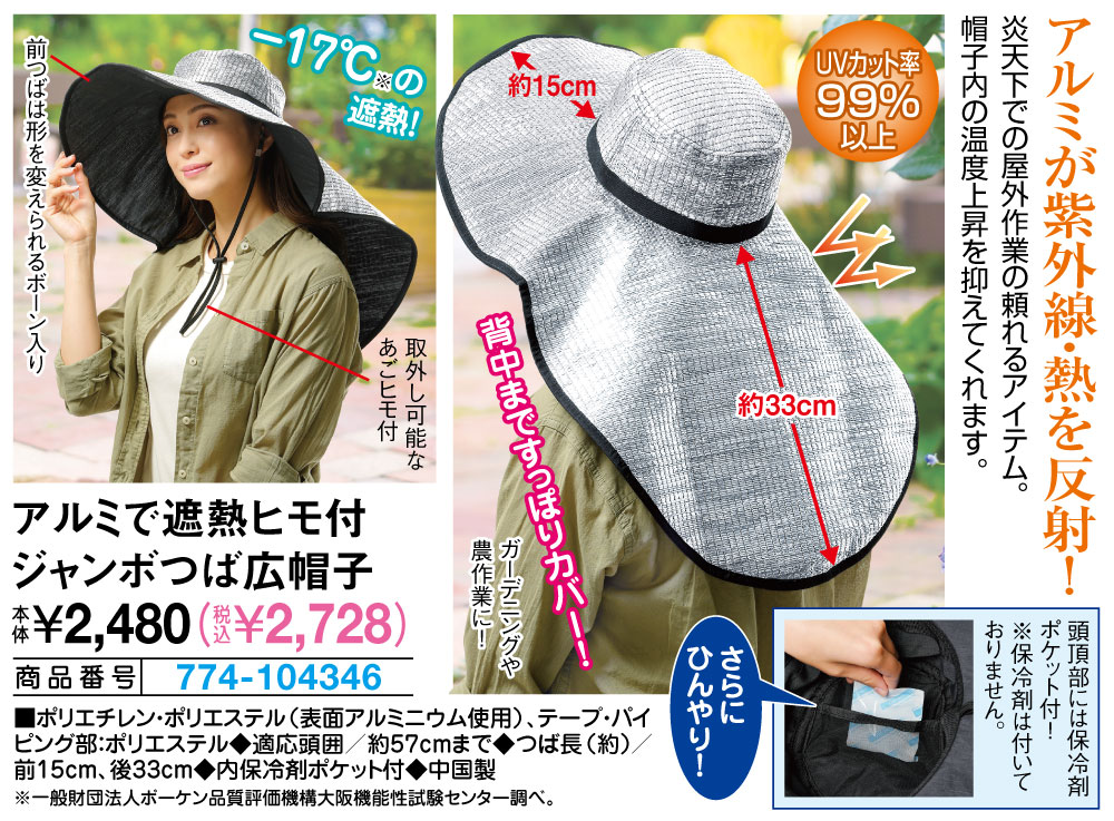 アルミが紫外線・熱をガードする帽子! 炎天下での屋外作業の頼れるアイテム、帽子内の温度上昇を抑えてくれます ガーデニングや農作業に! 前つばは形を変えられるボーン入り 背中まですっぽりカバー! 取外し可能なあごヒモ付 【さらにひんやり!】 頭頂部には保冷剤ポケット付! ●UVカット率99%以上