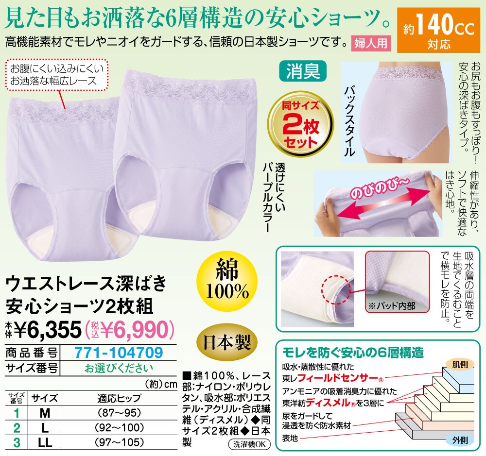 見た目もお洒落な6層構造の安心ショーツ! 高機能素材でモレやニオイをガードする、信頼の日本製ショーツです。 お尻もお腹もすっぽり!安心の深ばきタイプ。 お腹にくい込みにくいお洒落な幅広レース 伸縮性がありソフトなはき心地。 透けにくいパープルカラー 吸水層の両端を生地でくるむことで横モレを防止。 【モレを防ぐ安心の6層構造】 ●吸水・蒸散性に優れた東レフィールドセンサー(R) ●アンモニアの吸着消臭力に優れた東洋紡ディスメル(R)を3層に ●尿をガードして浸透を防ぐ防水素材 ●婦人用 ●約140cc対応 ●同サイズ2枚セット ●消臭