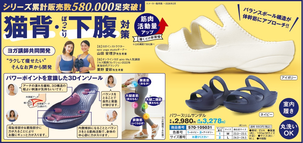 体幹を鍛えてぽっこりお腹を解消! 履いて歩くだけで気軽にフィットネスできる室内用サンダル! 底のバランスボール構造がコア筋にアプローチ! 夏に向けてスリム体質へ! 【アーチサポート】 アーチを支えて足疲れを軽減 ・外側縦アーチ ・横アーチ ・内側縦アーチ(土踏まず) 【かかと刺激】 バランス感覚と安定性が増し、自然と背筋が伸びる 【内側傾斜】 正しい重心をサポート 【ツボ刺激】 親指と母趾球を刺激し、腹圧を高める 【足指グリップ】 正しい歩行をサポート 【筋肉稼働率アップ!】 ・大腿二頭筋(裏太もも):約40%UP ・腹直筋(おなか):約61%UP ・腓腹筋(ふくらはぎ):約76%UP ・大腿直筋(前太もも):約27%UP ※静岡県工業技術研究所調べ ●室内履き