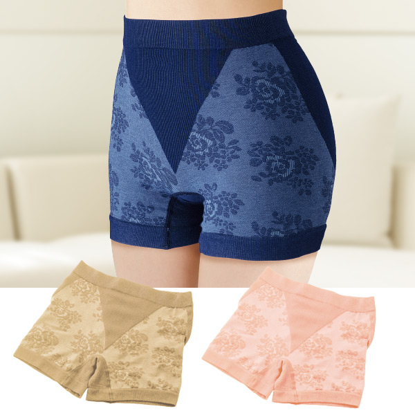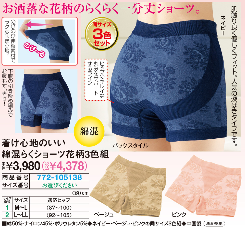 お洒落な花柄のらくらく一分丈ショーツ! 肌触り良く優しくフィット。 人気の深ばきタイプです。 ヒップのキレイな丸みをサポートするライン のびのび伸縮素材でラクなはき心地。 下腹の引き締め編みでお腹もすっきり! ●綿混 ●同サイズ3色セット