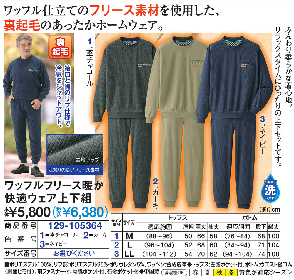 ワッフル仕立てのフリース素材を使用、裏起毛のホームウェア!