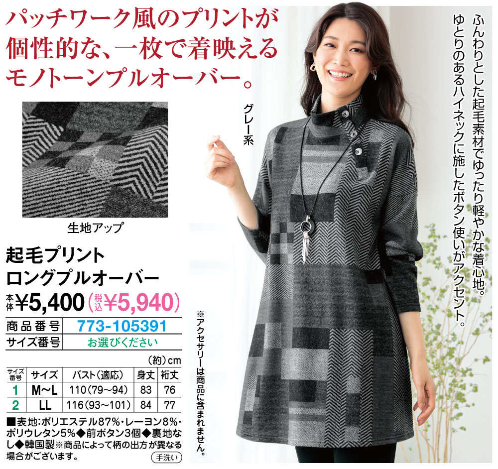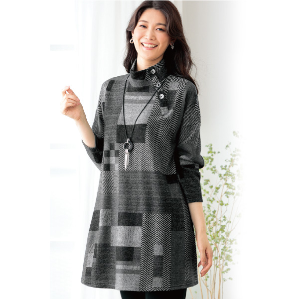 パッチワーク風のプリントが個性的な、一枚で着映えるモノトーンプルオーバー!