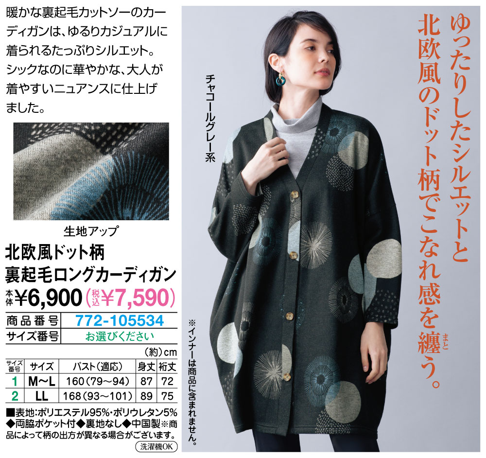 ゆったりしたシルエットと北欧風のドット柄でこなれ感を纏う! 暖かな裏起毛カットソーのカーディガンは、ゆるりカジュアルに着られるたっぷりシルエット。 シックなのに華やかな、大人が着やすいニュアンスに仕上げました。