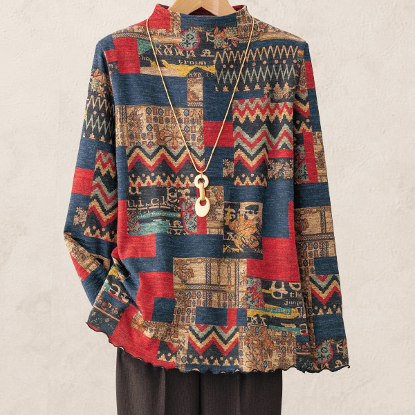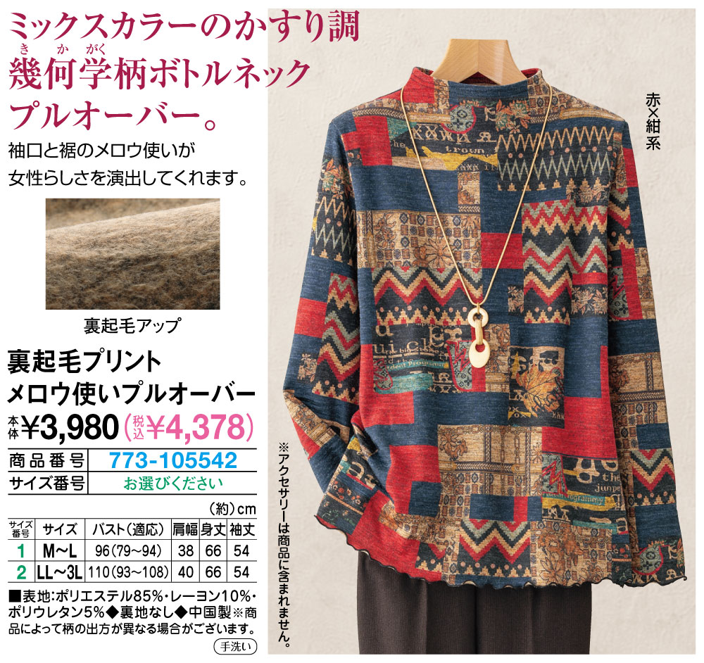 ミックスカラーのかすり調幾何学柄ボトルネックプルオーバー! 袖口と裾のメロウ使いが女性らしさを演出してくれます。