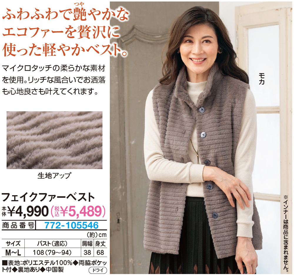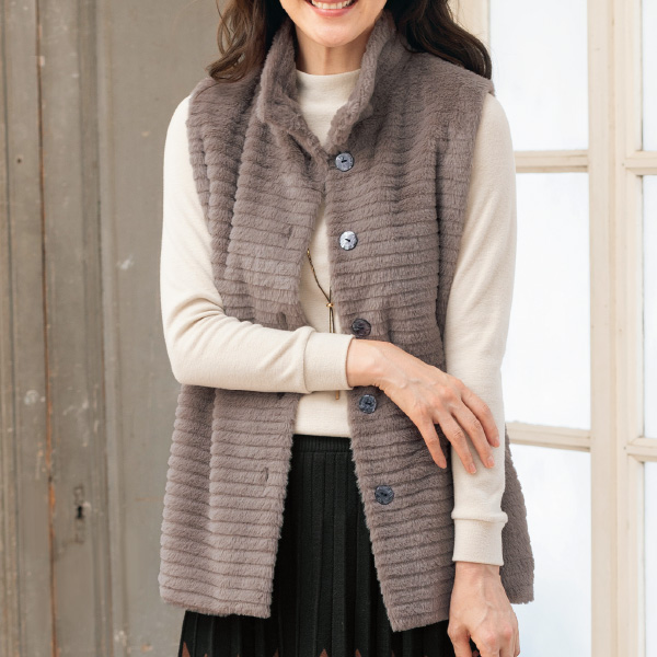ふわふわで艶やかなエコファーを贅沢に使った軽やかベスト! マイクロタッチの柔らかな素材を使用。 リッチな風合いでお洒落も心地良さも叶えてくれます。