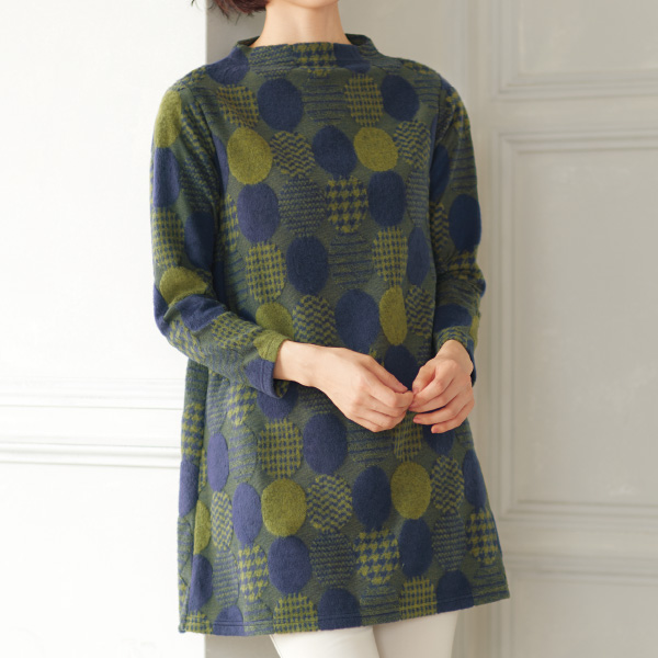 ふんわり起毛に浮かぶサークル柄が可愛いボトルネックチュニック! ボーダーやチェックなど様々な模様のサークル柄をジャカードカットソーに施し、優しい印象に。