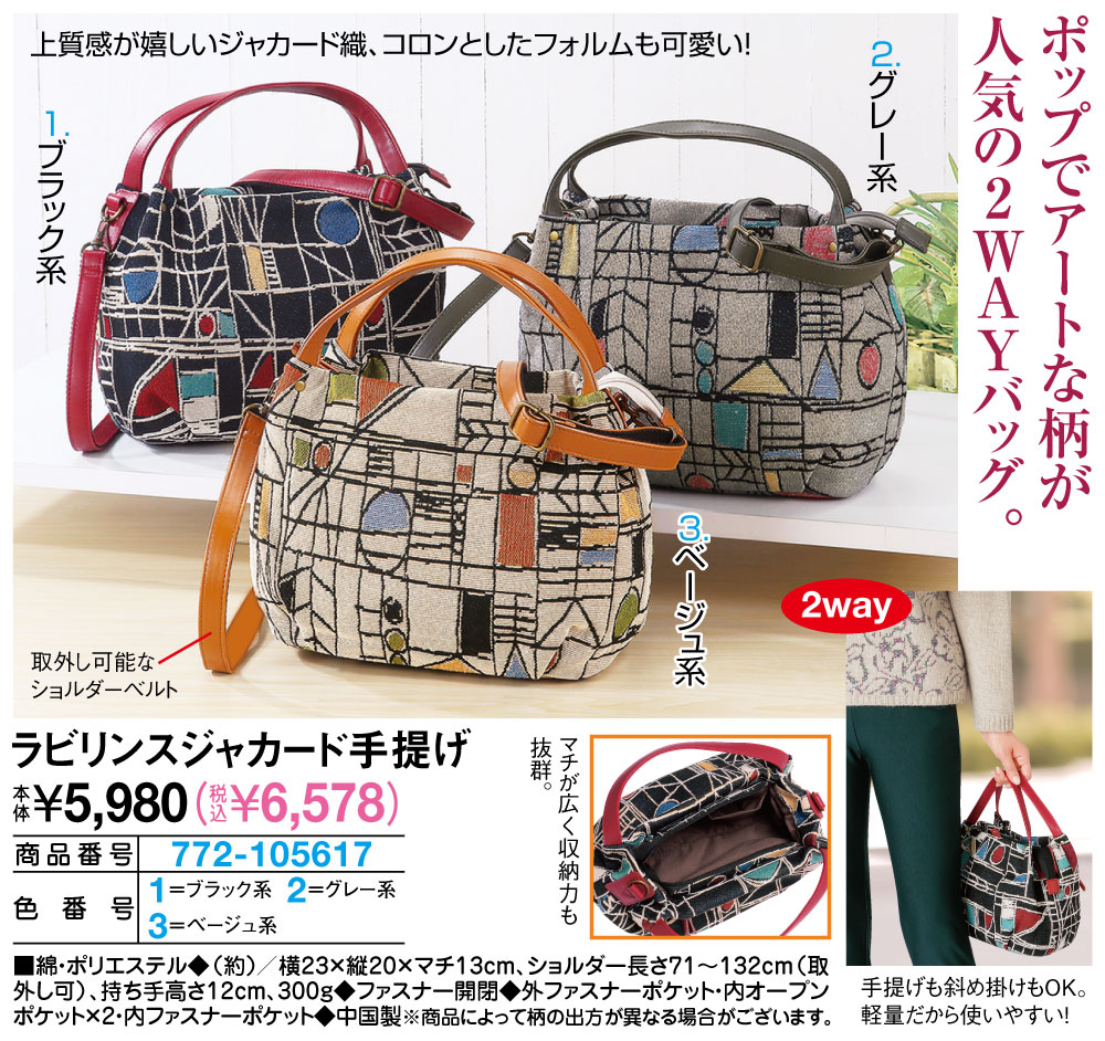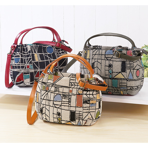 ポップでアートな柄が人気の2WAYバッグ! 上質感が嬉しいジャカード織、コロンとしたフォルムも可愛い! マチが広く収納力も抜群。 手提げも斜め掛けもOK。 軽量だから使いやすい! 取外し可能なショルダーベルト ●2way