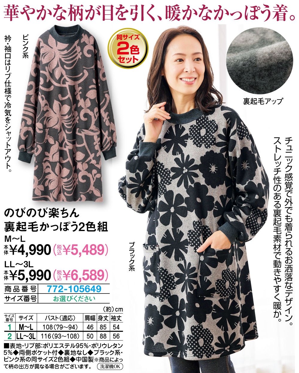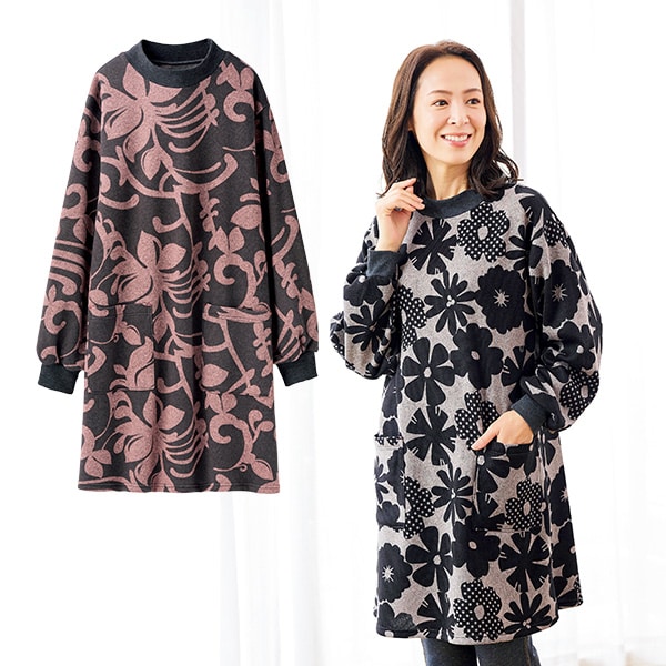 華やかな柄が目を引く、暖かなかっぽう着! ストレッチ性のある裏起毛素材で動きやすく暖か。 チュニック感覚で外でも着られるお洒落なデザイン。 衿・袖口はリブ仕様で冷気をシャットアウト。 ●同サイズ2色セット