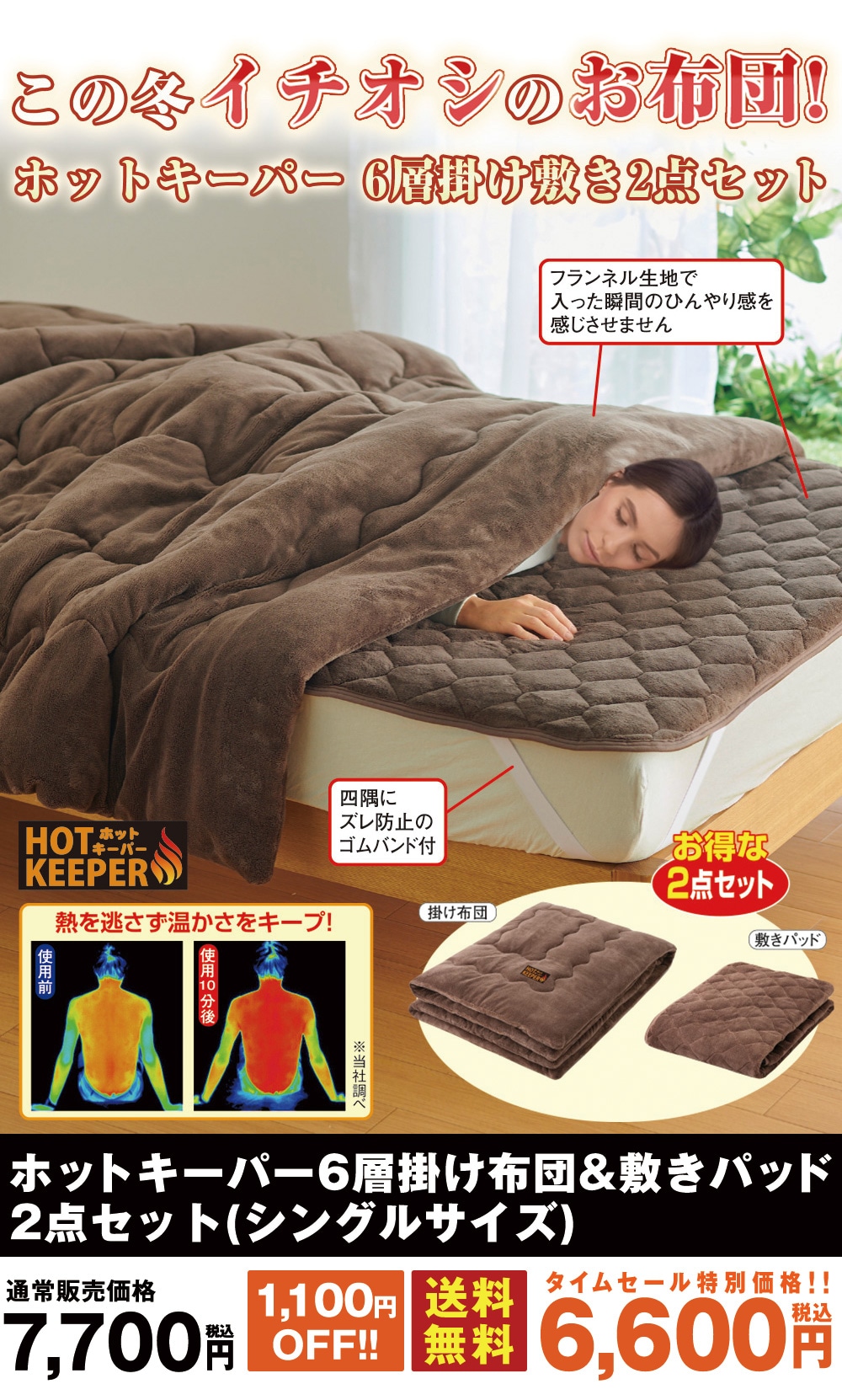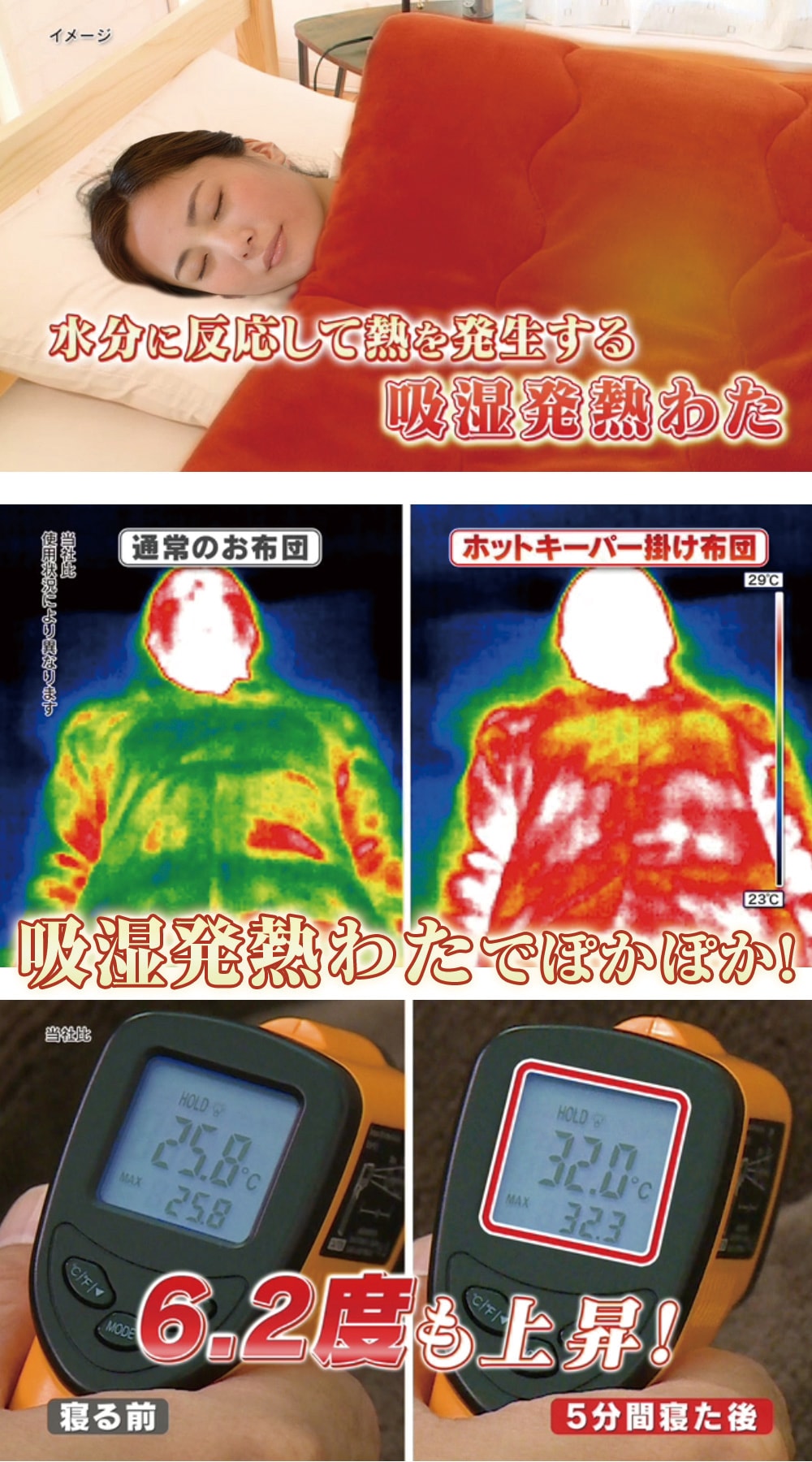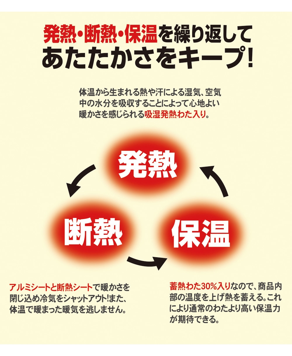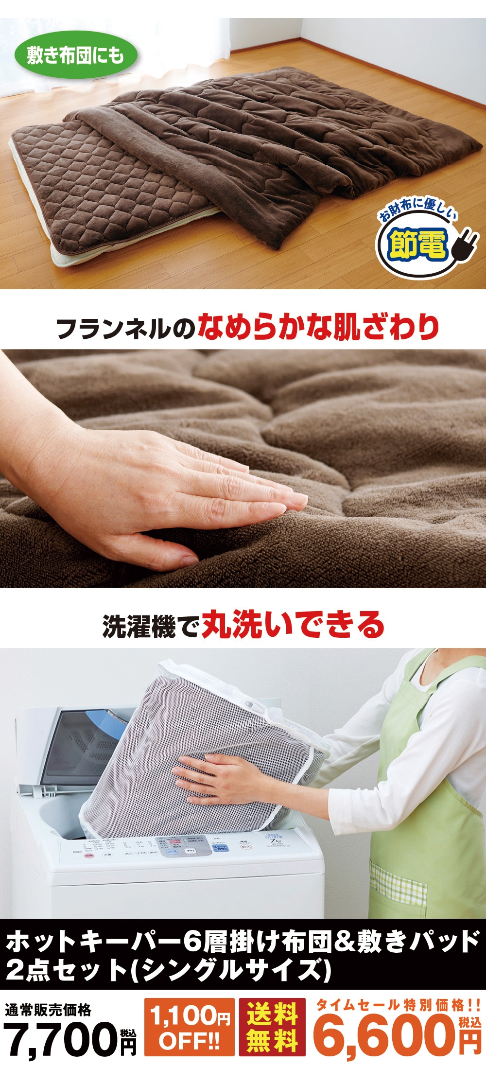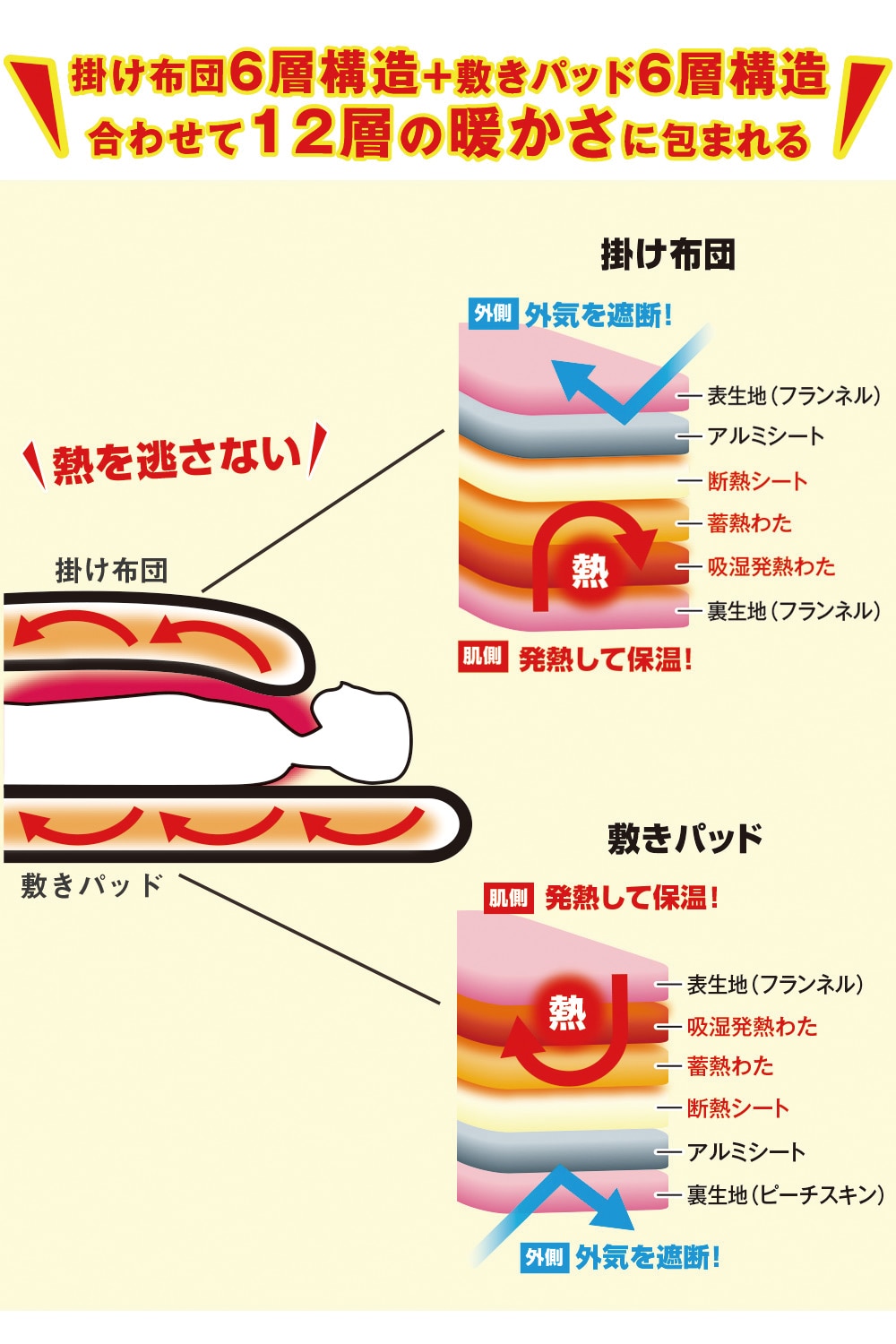 電気代不要!暖かさを逃さない超断熱シート入りの6層構造布団セット! 発熱・蓄熱わた入りで暖かく、さらに超断熱シートとアルミシートで外気や床からの冷気をダブルで遮断します。 フランネルのなめらかな肌ざわり フランネル生地で入った瞬間のひんやり感を感じさせません 四隅にズレ防止のゴムバンド付 洗濯機で丸洗いできる 【お得な2点セット】 ・掛け布団 ・敷きパッド ●お財布に優しい節電 ●ホットキーパー ●敷き布団にも 【こだわりのポイントはここ!】 あたたかい空気の層をつくるこだわりの6層構造 表生地(フランネル)/アルミシート/超断熱シート/蓄熱わた/吸湿発熱わた/裏生地(フランネル) 外側:外気を遮断! 肌側:発熱して保温! 発熱・断熱・保温を繰り返してあたたかさをキープ! 熱を逃さない 熱を当てると、どんどん熱が溜まっていく。熱を逃さず温かさをキープ!