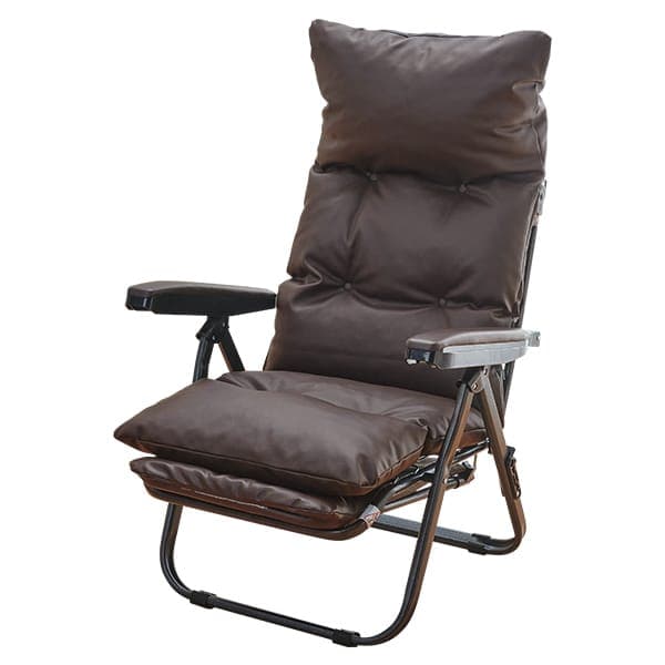 ●(約)/幅64×奥行77~120(フットレスト使用時160)×高さ60~101(座面高39)cm、10.8kg、<折りたたみ時>幅64×奥行38×高さ80cm、<背もたれ長さ>70cm ●<表地>PVCレザー、<裏地>ポリエステル、<中材>スチール・チップウレタン ●耐荷重/約100kg ●中国製 ◆クッションのみ取付け