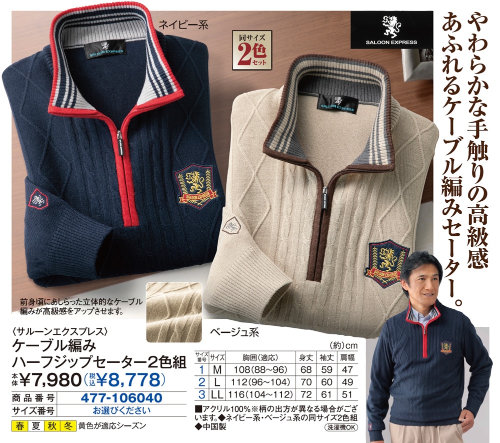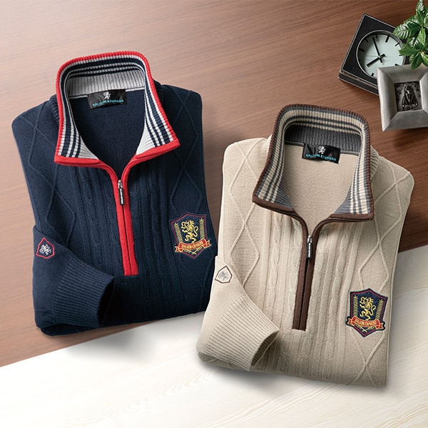 やわらかな手触りの高級感あふれるケーブル編みセーター 前身頃にあしらった立体的なケーブル編みが高級感をアップさせます。