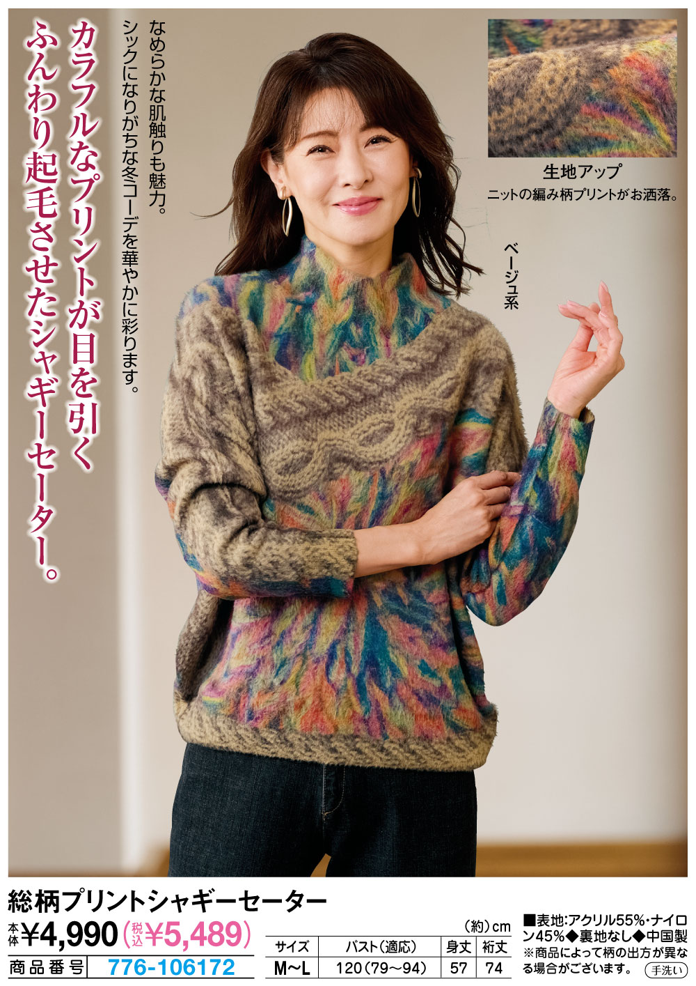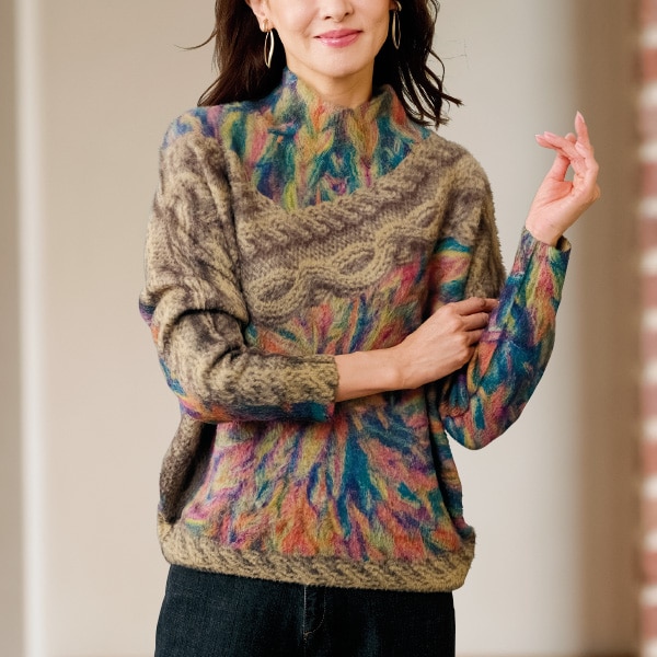 カラフルなプリントが目を引くふんわり起毛させたシャギーセーター! なめらかな肌触りも魅力。 シックになりがちな冬コーデを華やかに彩ります。 ニットの編み柄プリントもお洒落。