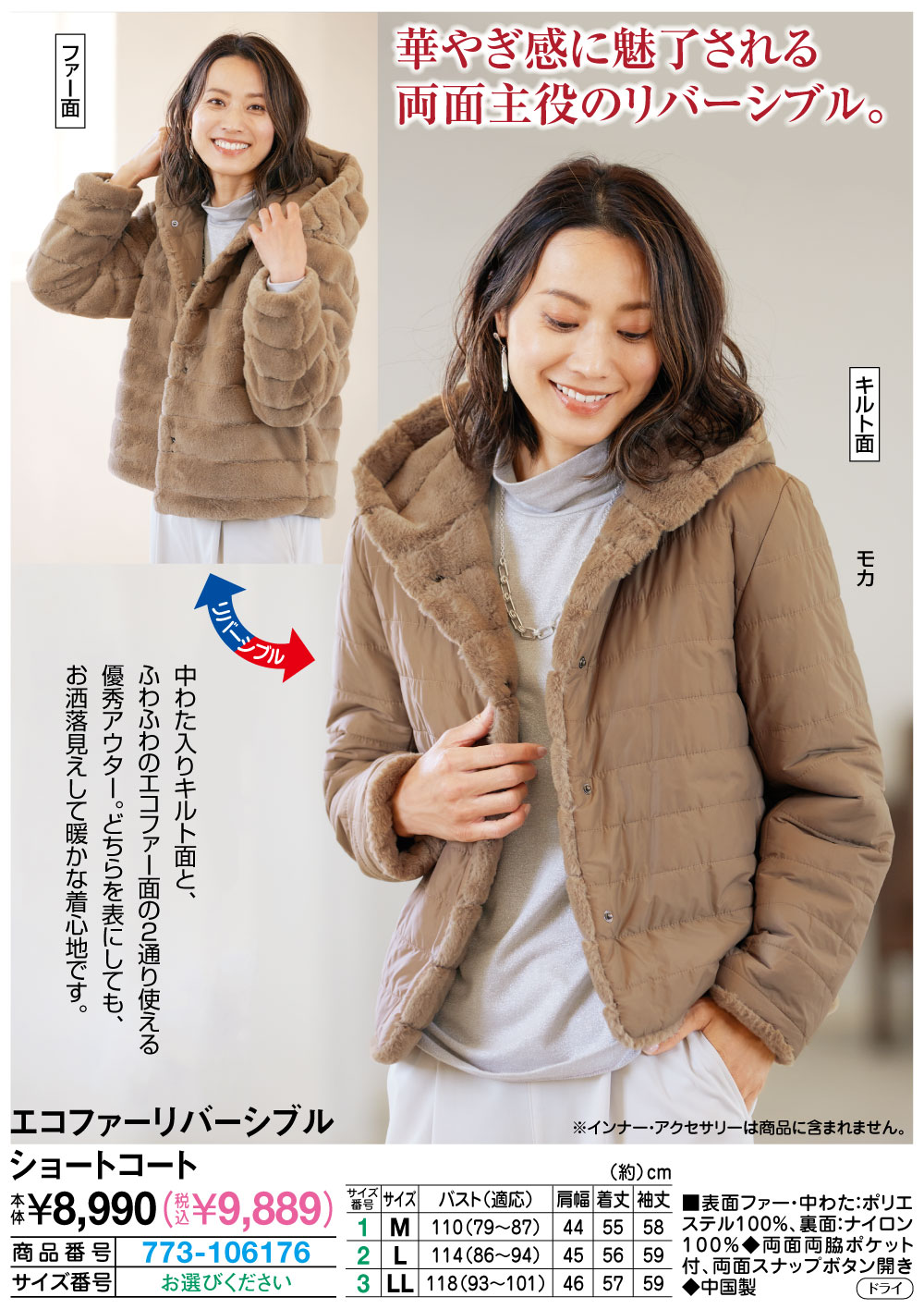 【サイズ(約)】 バスト(適応)、肩幅、着丈、袖丈 <M>110(79~87)cm、44cm、55cm、58cm <L>114(86~94)cm、45cm、56cm、59cm <LL>118(93~101)cm、46cm、57cm、59cm ■表面ファー・中わた:ポリエステル100%、裏面:ナイロン100% ◆両面両脇ポケット付、両面スナップボタン開き ◆中国製