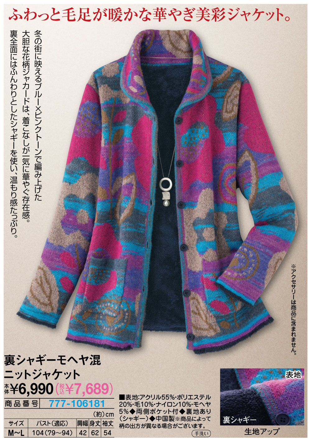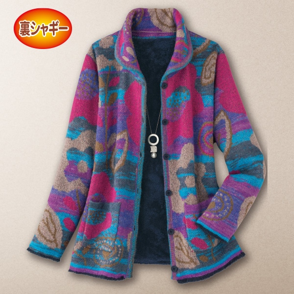 ふわっと毛足が暖かな華やぎ美彩ジャケット! 冬の街に映えるブルー×ピンクトーンで編み上げた大胆な花柄ジャカードは、着こなしが一気に華やぐ存在感。 裏全面にはふんわりとしたシャギーを使い、温もり感たっぷり。 ●裏シャギー