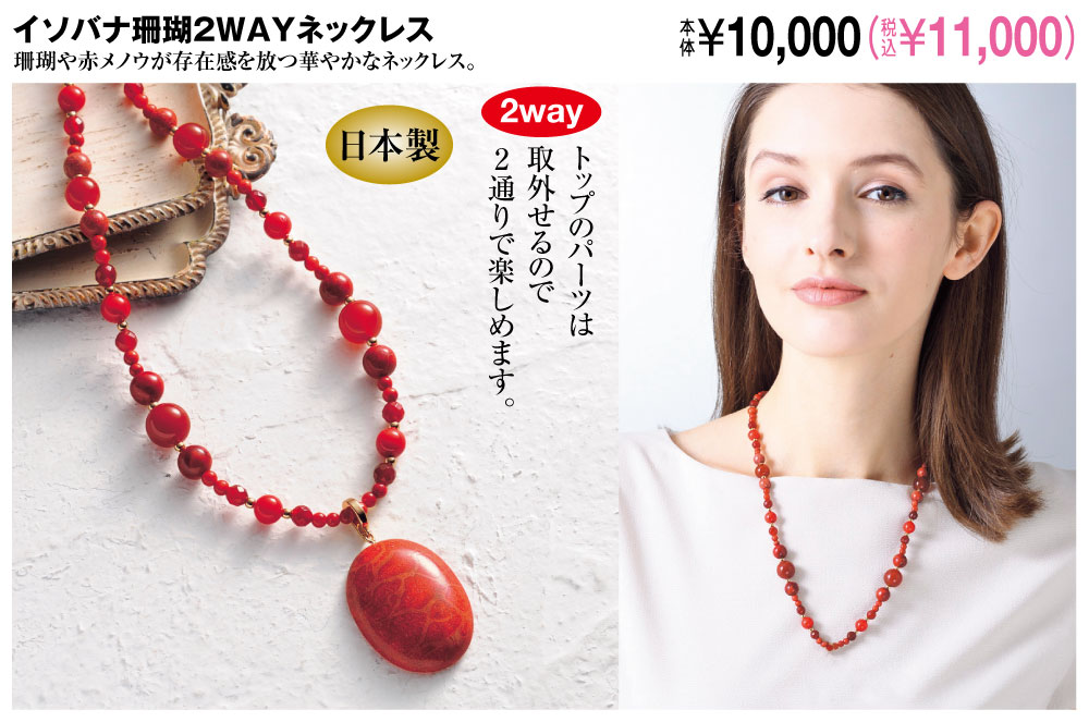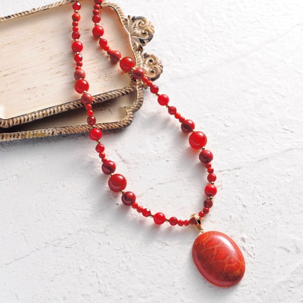 イソバナ珊瑚を中心に赤メノウなど赤系のストーンでまとめた華やかなネックレス! トップの大ぶりパーツは取外せるので2通りで楽しめます。 ●2way